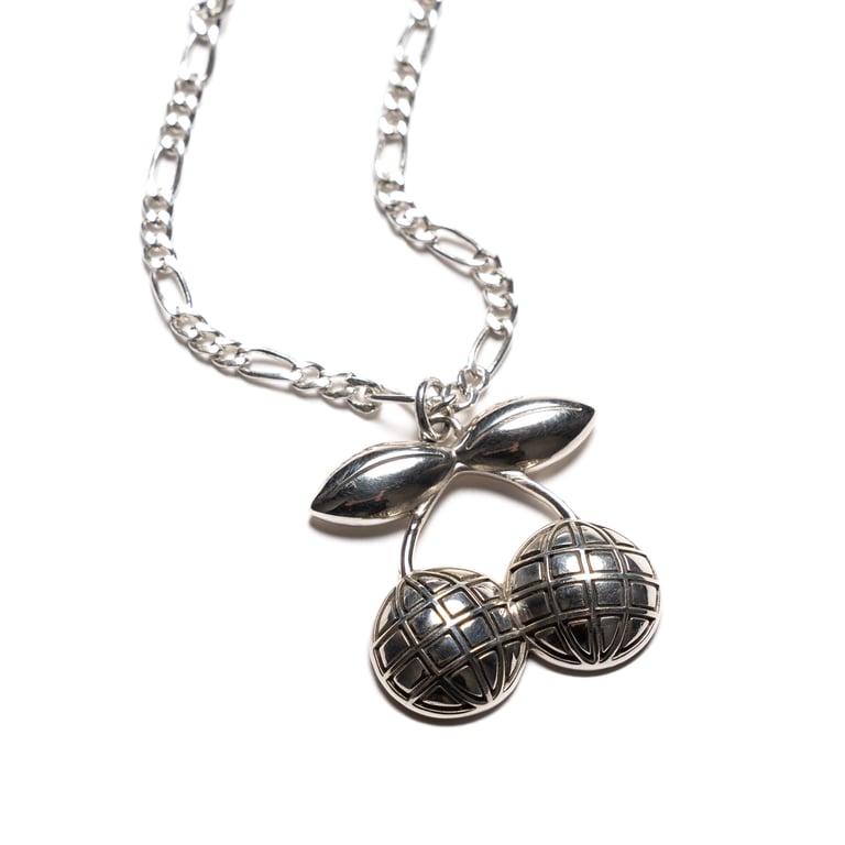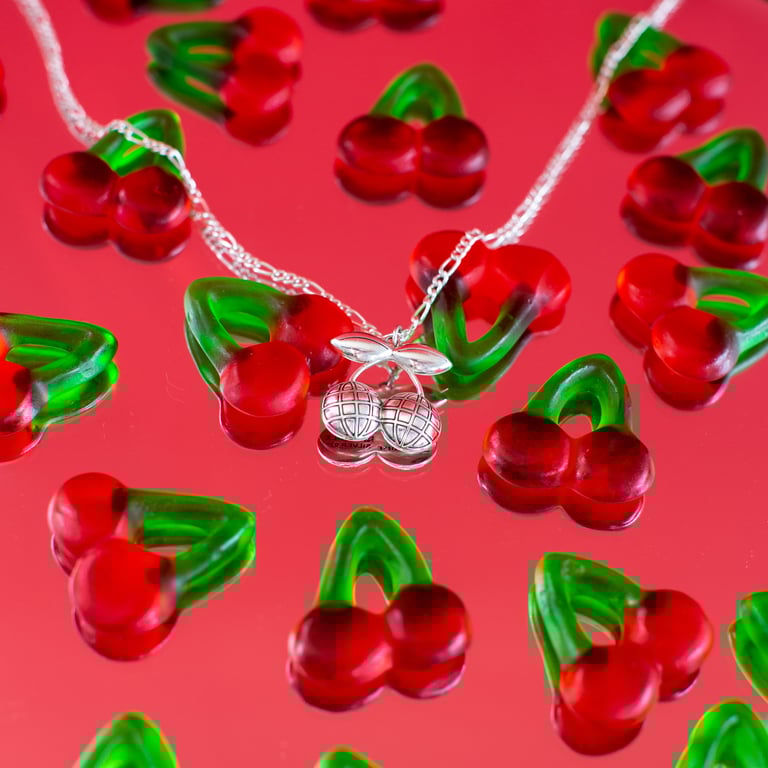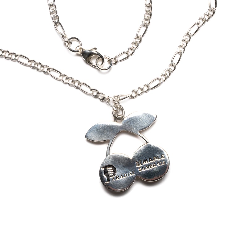 The *LIMITED EDITION* Paradiza pendant features a heavy, solid silver 925 Paradise Disco Cherries logo and sits on a silver 925 MAPLE flat chain in 50cm, 60cm, or 70cm lengths.