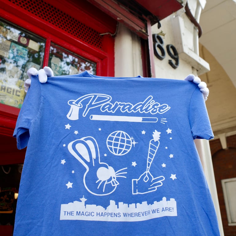 Abracadabra! Designed courtesy of our friend Deep Gnome, this limited edition "The Magic of Paradise" T-Shirt is the latest trick up our sleeve for Summer 2024. Made on heavy-weight, Comfort Colors garment-dyed soft ring spun fabric in a unique blue hue that carries more colour depth than a regular ol' tee. The quality of the shirt has a broken-in feel, just like a vintage T-shirt that was washed or worn for a decade or two. Available sizes Medium - XXL. Please see product photos for size chart.